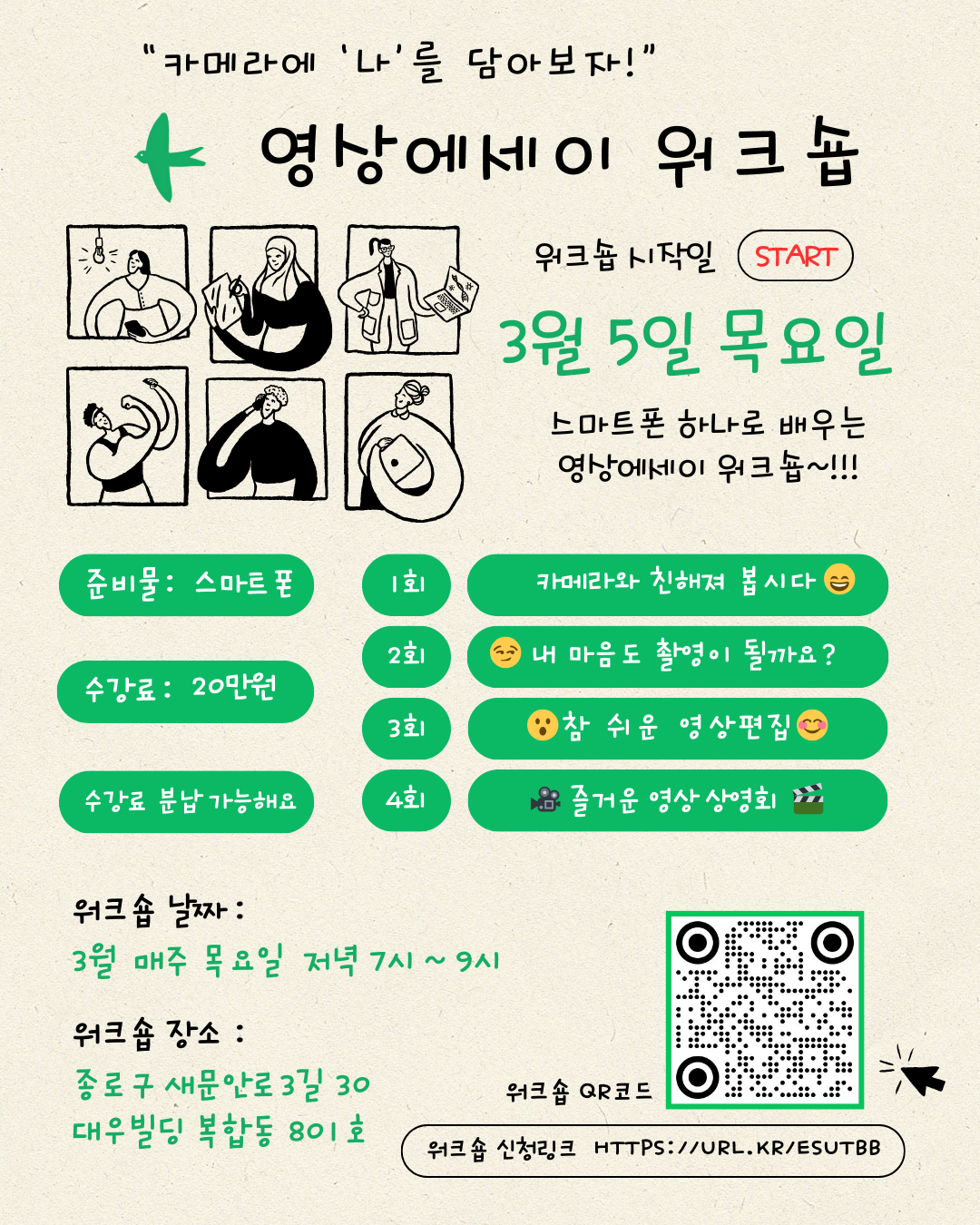 💚🎥 [ 영상 에세이 워크숍 ] 🎥💚 신청링크 http://url.kr/esutbb📱 스마트폰만 있어도 영상을 찍을 수는 있지만,내 생각과 감정까지 온전히 담아내기엔 ...